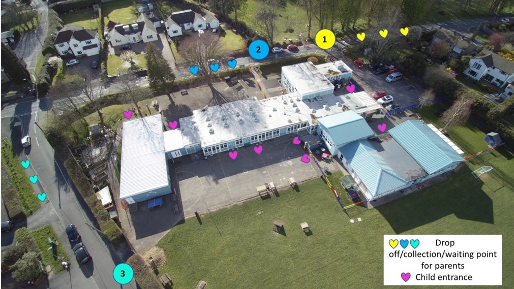 - Children will need to be dropped off and collected at different gates outside the school grounds. No adults will be permitted to enter the grounds or the building without prior appointment. Information about gates will be contained in the invitation to school email. Please see the map below.