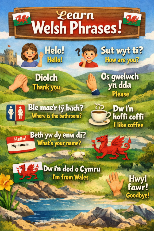 - Promoting simple Welsh phrases in classrooms, corridors and the playground